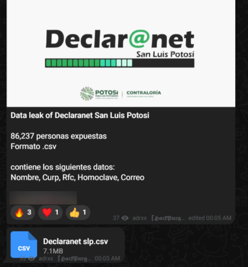 La presunta filtración fue difundida a través de canales de Telegram, donde circularon archivos con bases de datos exfiltradas. Según la publicación atribuida al usuario adrxx, integrante del grupo de ciberdelincuencia Chronus, la información procede directamente del sistema DeclaraNet. Villaseñor señaló que varias CURP coinciden con los RFC correspondientes y que distintos registros pertenecen a trabajadores del Gobierno estatal.